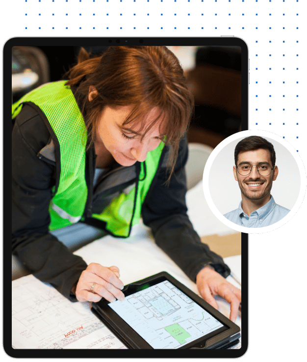 タブレットで Bluebeam Cloud ソフトウェアを表示している建設作業員
