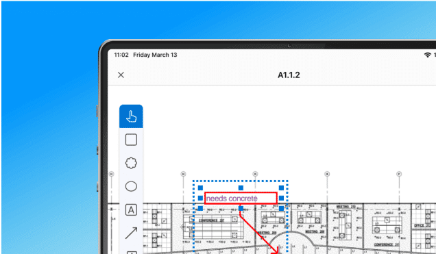 Mit Bluebeam Cloud kannst du Pläne mit Sprechblasen, Vektor Stift, Stift, Textmarker, Ellipsen, Wolken und Bildern auf deinem iPad oder iPhone markieren.