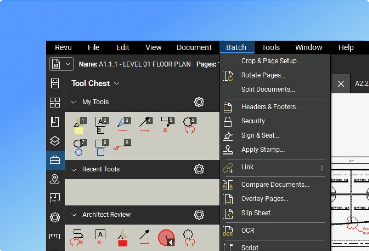 Automates tedious tasks for large drawing sets, so you save time and avoid manual errors keying in the same changes over and over. Several batch features help Revu power users make bulk changes faster and more accurately.